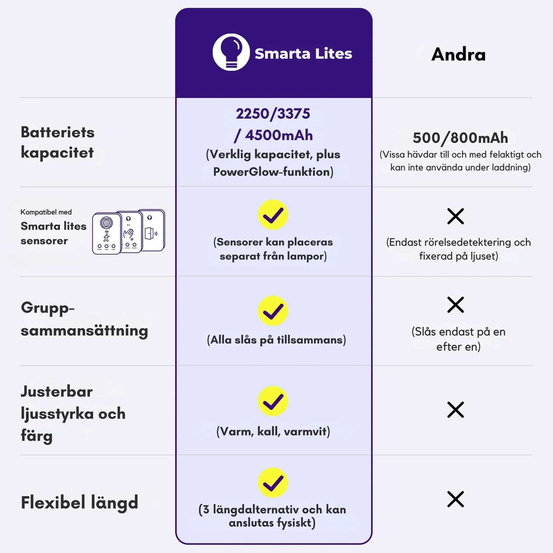 Vi hoppas att dessa förbättringar löser dina bekymmer om batteritiden. Och vi är övertygade om att Smarta Lites Allround Ljus kommer att uppfylla och överträffa dina förväntningar.